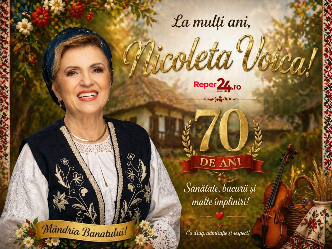 La ceas aniversar, Banatul se înclină în fața uneia dintre cele mai autentice și iubite voci ale sale. Nicoleta Voica împlinește astăzi 70 de ani de viață, dintre care decenii de-a rândul dedicate cântecului popular, tradiției și identității românești.
