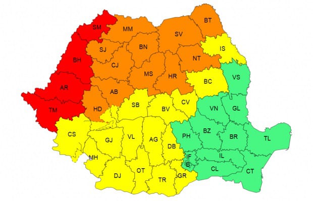 În nordul Banatului, Crișana, Maramureș, cea mai mare parte a Transilvaniei și nordul Moldovei sunt sub cod portocaliu, meteorologii anunțând vijelii puternice (viteze ale vântului de 70…90 km/h), grindină de medii și mari dimensiuni (2-5 cm), frecvente descărcări electrice și averse torențiale. În intervale scurte de timp (1-3 ore) cantitățile de apă vor fi de 25…40 l/mp și pe arii restrânse vor depăși 50 l/mp. Cod roșu de instabilitate a fost anunțat pentru județele Timiș, Arad, Bihor și Satu Mare, unde vor fi vijelii puternice, cu rafale ce vor depăși viteze de 90…100 km/h.