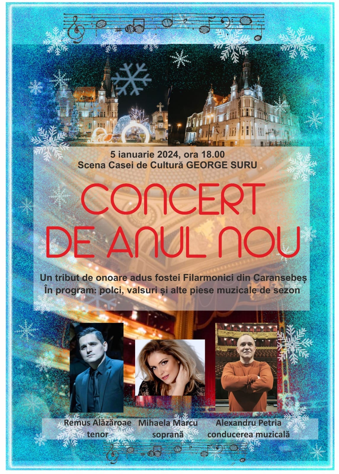 Concertul de Anul Nou va avea loc pe scena Casei de Cultură „George Suru”, începând cu ora 18:00.