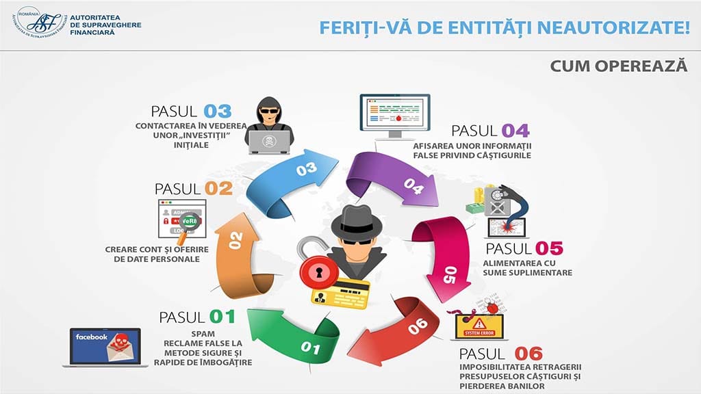 Autoritatea de Supraveghere Financiară (ASF) face publică schema prin care sunt înșelați românii de așa-ziși brokeri neautorizați. ASF a prezentat modul în care operează acești falși brokeri și cum sustrag aceștia banii din conturile românilor. Este vorba despre o schemă în șase pași.