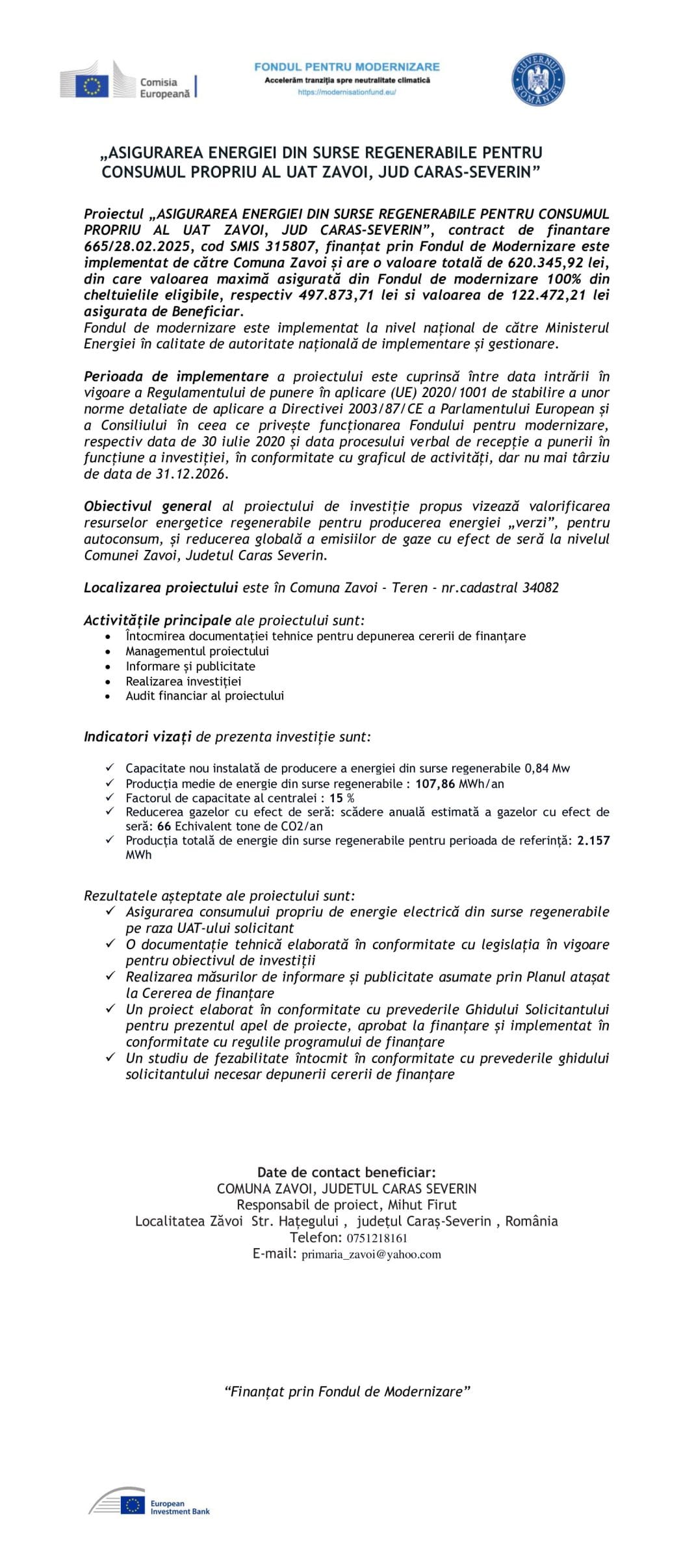 Anunțuri „ASIGURAREA ENERGIEI DIN SURSE REGENERABILE PENTRU CONSUMUL PROPRIU AL UAT ZAVOI, JUD CARAS-SEVERIN” 22 aprilie 2025 Acțiune FacebookWhatsAppEmailImprimare Acțiune FacebookWhatsAppEmailImprimare Articolul precedentStart lucrări la Reșița! „O să se schimbe radical zona”!Articolul următor„Lumină din Lumină”, cea de-a treia ediție a Concertului Pascal de la Bocșa Știrile zilei Banatul Montan, pe harta lumii. Șansă istorică pentru satele din Caraș-Severin 16 aprilie 2026 Primăvară în alai, pe-un picior de plai! 16 aprilie 2026 Reșița interzice jocurile de noroc! Când dispar ultimele aparate din oraș? 15 aprilie 2026