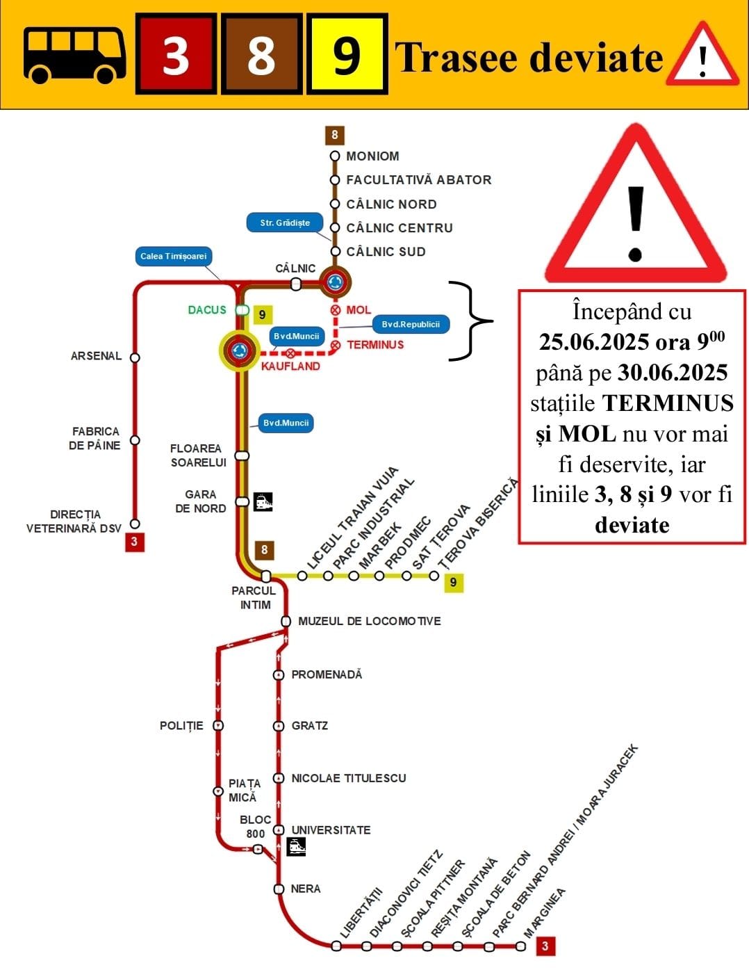 De asemenea, pentru traseele de transport public, prima stație de plecare va fi relocată în fața magazinului Dacus. Cei de la Transport Urban Reșița precizează că stațiile Terminus și Mall nu vor mai fi deservite, iar liniile 3, 8 și 9 vor fi deviate.