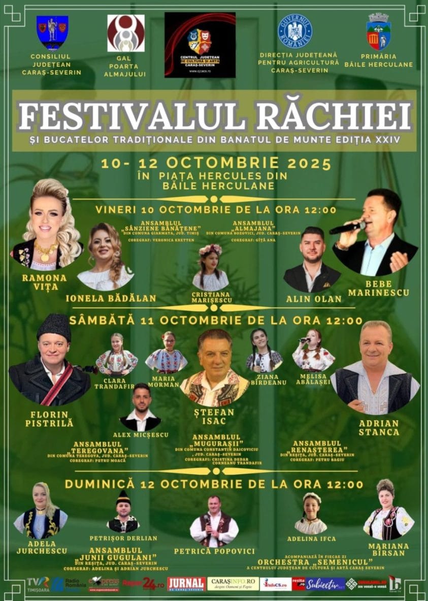 Între 10 și 12 octombrie 2025, Piața Hercules din Băile Herculane va deveni centrul distracției bănățene, găzduind cea de-a XXIV-a ediție a Festivalului Răchiei și al Bucatelor Tradiționale din Banatul de Munte. Evenimentul, organizat de Consiliul Județean Caraș-Severin, în parteneriat cu Centrul Județean de Cultură și Artă Caraș-Severin, Direcția Județeană pentru Agricultură Caraș-Severin, GAL Poarta Almăjului și Primăria Băile Herculane, aduce laolaltă tradițiile, gusturile și spiritul autentic al Banatului Montan.