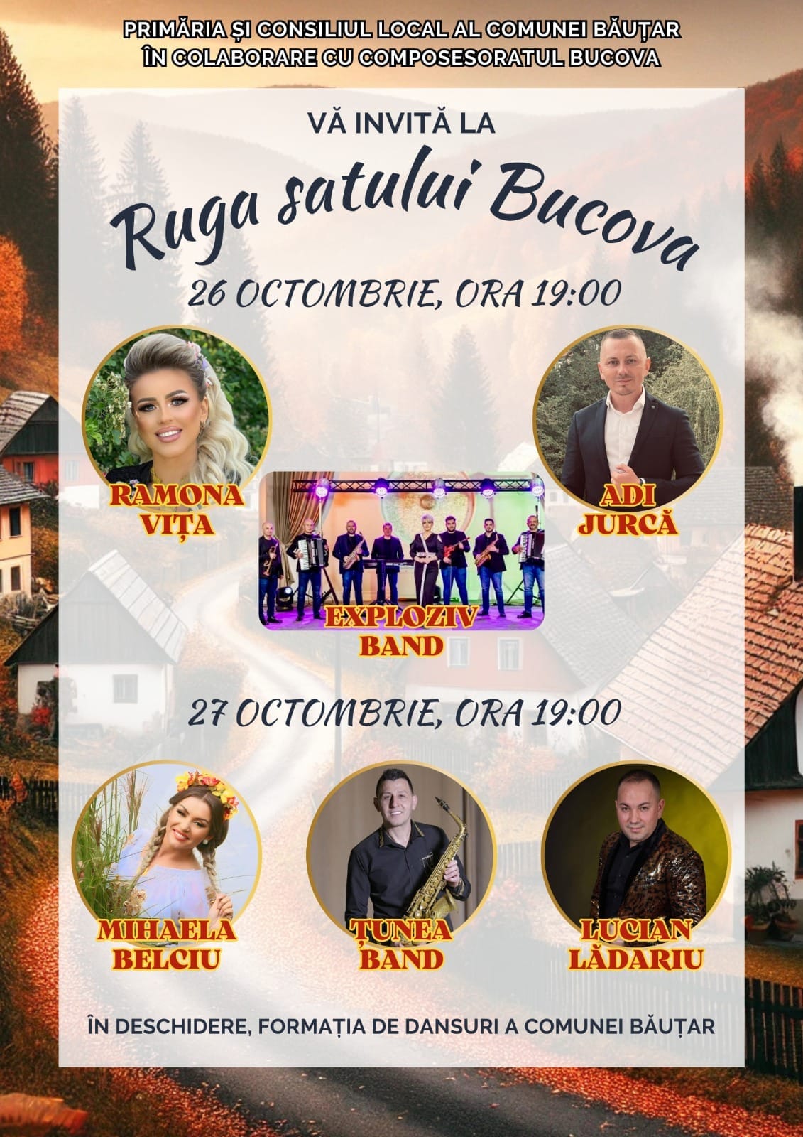 Ziua următoare, mai exact în 27 octombrie, vor întreține atmosfera de sărbătoare, soliștii Mihaela Belciu și Lucian Lădariu, alături de formația Țunea Band.