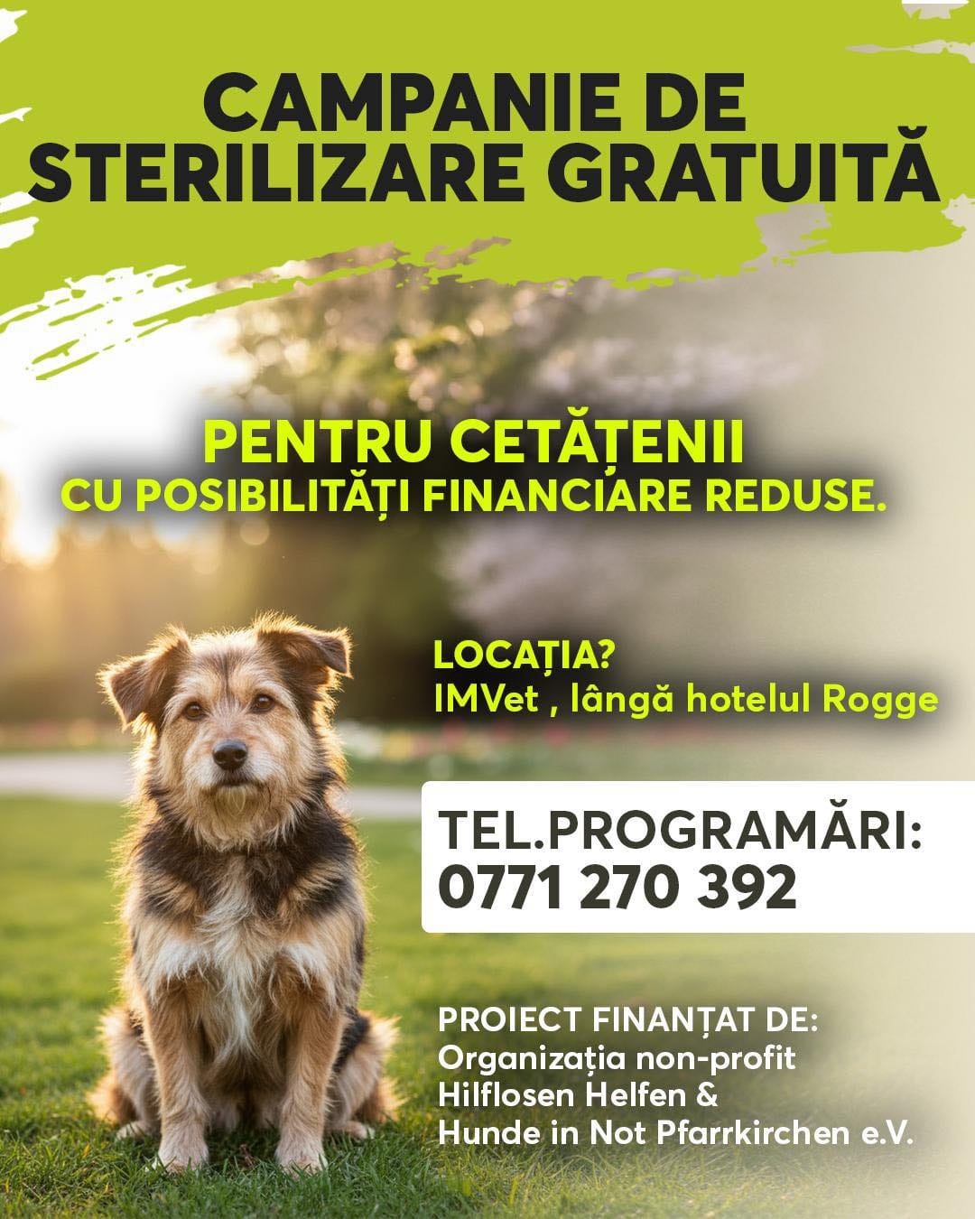 Locația este Clinica IMVet, lângă Hotel Rogge (zona centrală), iar campania este permanentă – programările se fac în funcție de cereri și de fondurile disponibile la telefon 0771 270 392 (număr dedicat strict pentru sterilizările gratuite)