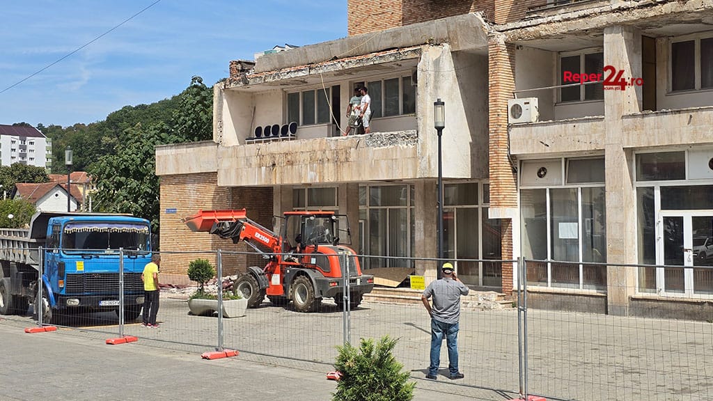 Am observat că întreaga zonă este împrejmuită de garduri de protecție, un camion și un buldoexcavator erau angrenate în subiect iar la etajul 1 al hotelului, altădată un simbol al seratelor reșițene, mai mulți flăcăi lucrau cu un utilaj pentru îndepărtarea plăcilor de marmură care ar putea reprezenta un pericol pentru cetățenii orașului și pentru orice trecător, s-o recunoaștem, după ce am văzut ce nenorocire se putea produce la jumătatea lunii iulie a acestui an.