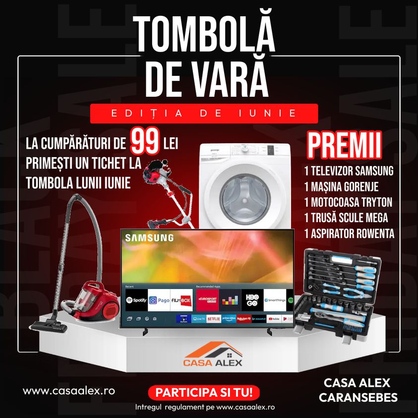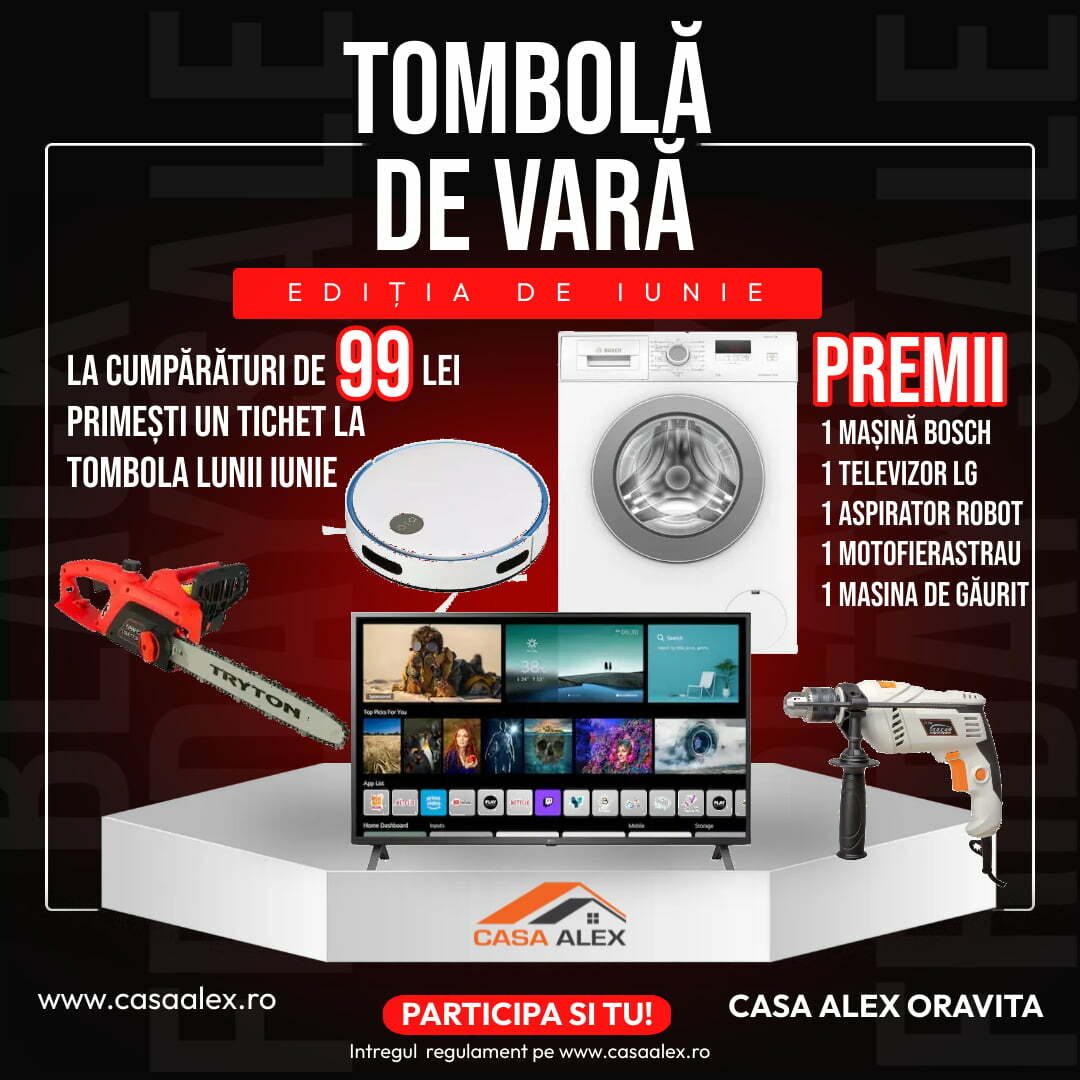 Dacă veți cumpăra de la Casa Alex din Caransebeș sau Oravița în perioada 1 iunie – 30 iunie, aveți șansa să câștigați unul dintre Marile Premii pregătite special pentru dumneavoastră: televizoare LED Samsung și LG, aspiratoare, mașini de spălat rufe, truse de scule, un motofierăstrău sau o motocoasă.