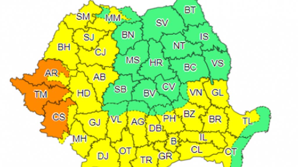 Sâmbătă între orele 12:00 – 22:00, vor fi perioade cu instabilitate atmosferică accentuată, la început în Banat, Oltenia și în zonele montane, apoi în extindere în toată jumătatea vestică a teritoriului. Vor fi averse torențiale, descărcări electrice, intensificări ale vântului și pe alocuri vijelii și grindină.
