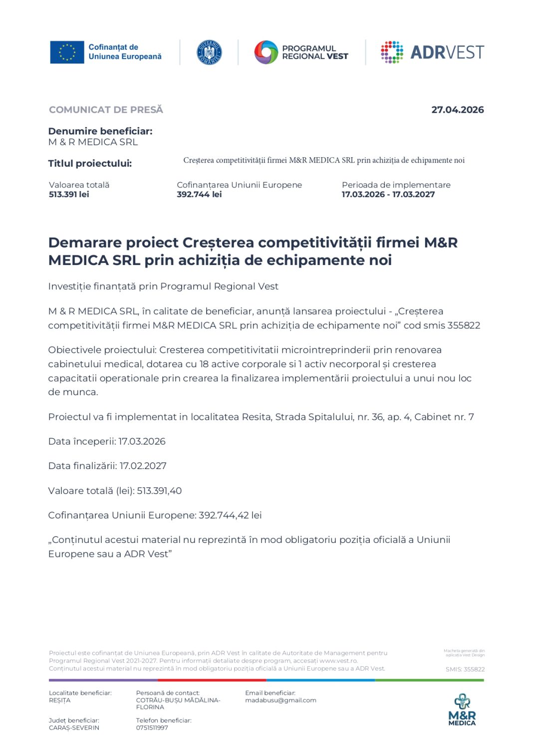 Anunțuri Demarare proiect Creșterea competitivității firmei M&R MEDICA SRL prin achiziția de echipamente noi 28 aprilie 2026 Acțiune FacebookWhatsAppImprimare Acțiune FacebookWhatsAppImprimare Articolul precedentInvestiție vitală pentru inima cărășenilor: Unitate de tratament critic la Spitalul Județean din ReșițaArticolul următor1 Mai la Bocșa: muzică, tradiții și voie bună în zona „Groza” LĂSAȚI UN MESAJ Renunțați la răspuns Comentariu: Vă rugăm să introduceți comentariul dvs.! Nume:* Introduceți aici numele dvs. Email:* Ați introdus o adresă de e-mail incorectă! Vă rugăm să introduceți adresa dvs. de e-mail aici Website: Salvați numele meu, adresa de e-mail și site-ul web în acest browser pentru data viitoare i comentariu. Δ Știrile zilei Se reiau cursele spre Șură în minivacanța de 1 Mai! 28 aprilie 2026 Prefectul Dragomir, pregătit să își dea demisia! „Caraș-Severin nu va fi un caz special” 28 aprilie 2026 1 Mai la Bocșa: muzică, tradiții și voie bună în zona „Groza” 28 aprilie 2026