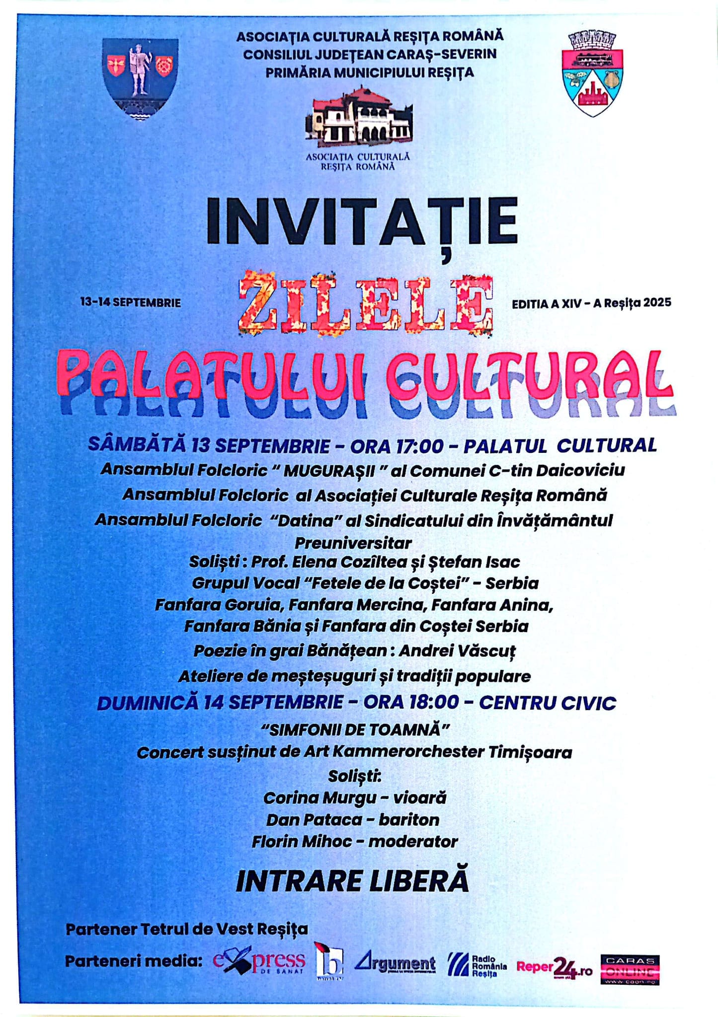 Asociația Culturală Reșița Română invită publicul reșițean (și nu numai) la cea de-a XIV-a ediție a festivalului „Zilele Palatului Cultural din Reșița”, un eveniment dedicat promovării culturii și tradițiilor din Banatul de Munte. Manifestarea se va desfășura în zilele de 13 și 14 septembrie, atât la Palatul Cultural, cât și în centrul civic al Reșiței. Programul evenimentului este variat și include spectacole folclorice, muzică simfonică și ateliere de meșteșuguri.