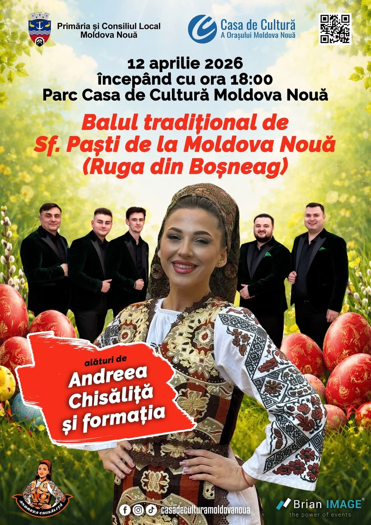 Petrecerea va debuta în forță duminică, 12 aprilie 2026, începând cu ora 18:00. Locul de întâlnire este Parcul Casei de Cultură din Moldova Nouă (Boșneag). Prima seară va fi sub bagheta muzicală a îndrăgitei interprete Andreea Chișăliță, care, alături de formația sa, promite un repertoriu menit să încălzească sufletele celor prezenți.