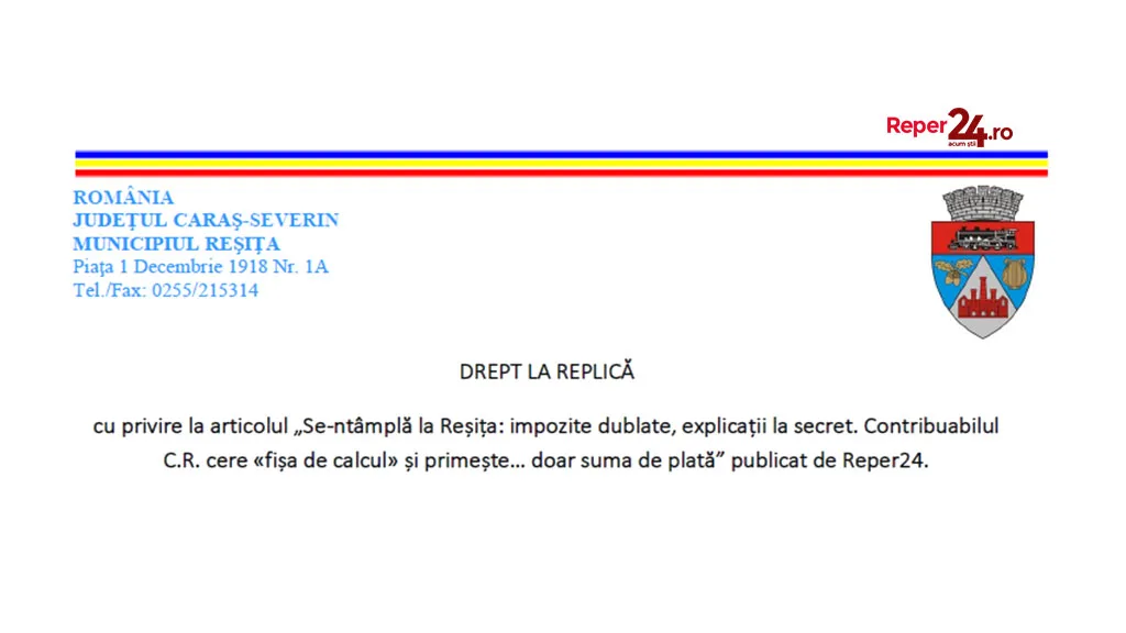 cu privire la articolul „Se-ntâmplă la Reșița: impozite dublate, explicații la secret. Contribuabilul C.R. cere «fișa de calcul» și primește… doar suma de plată” publicat de Reper24.