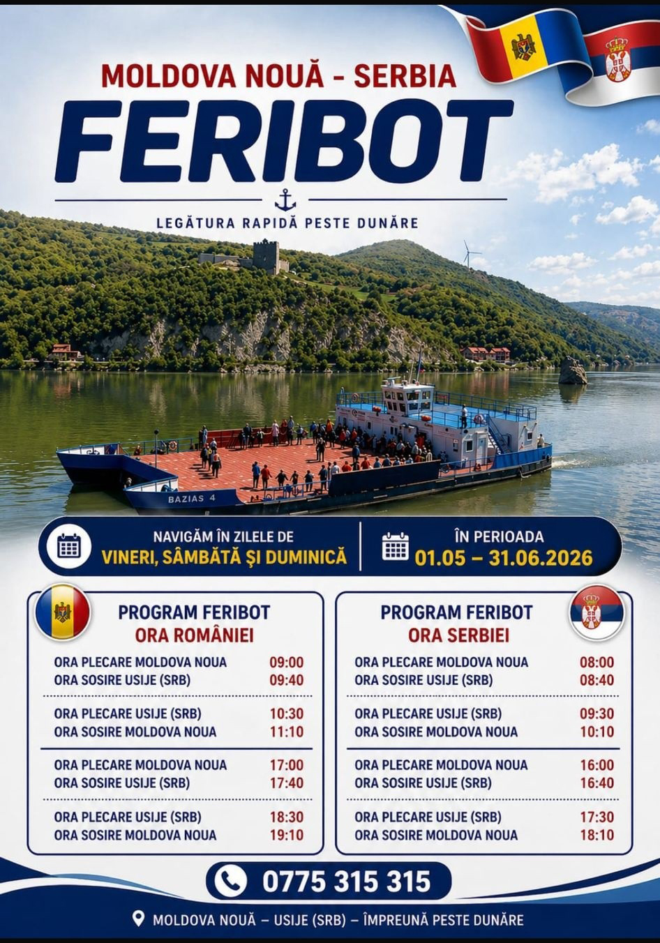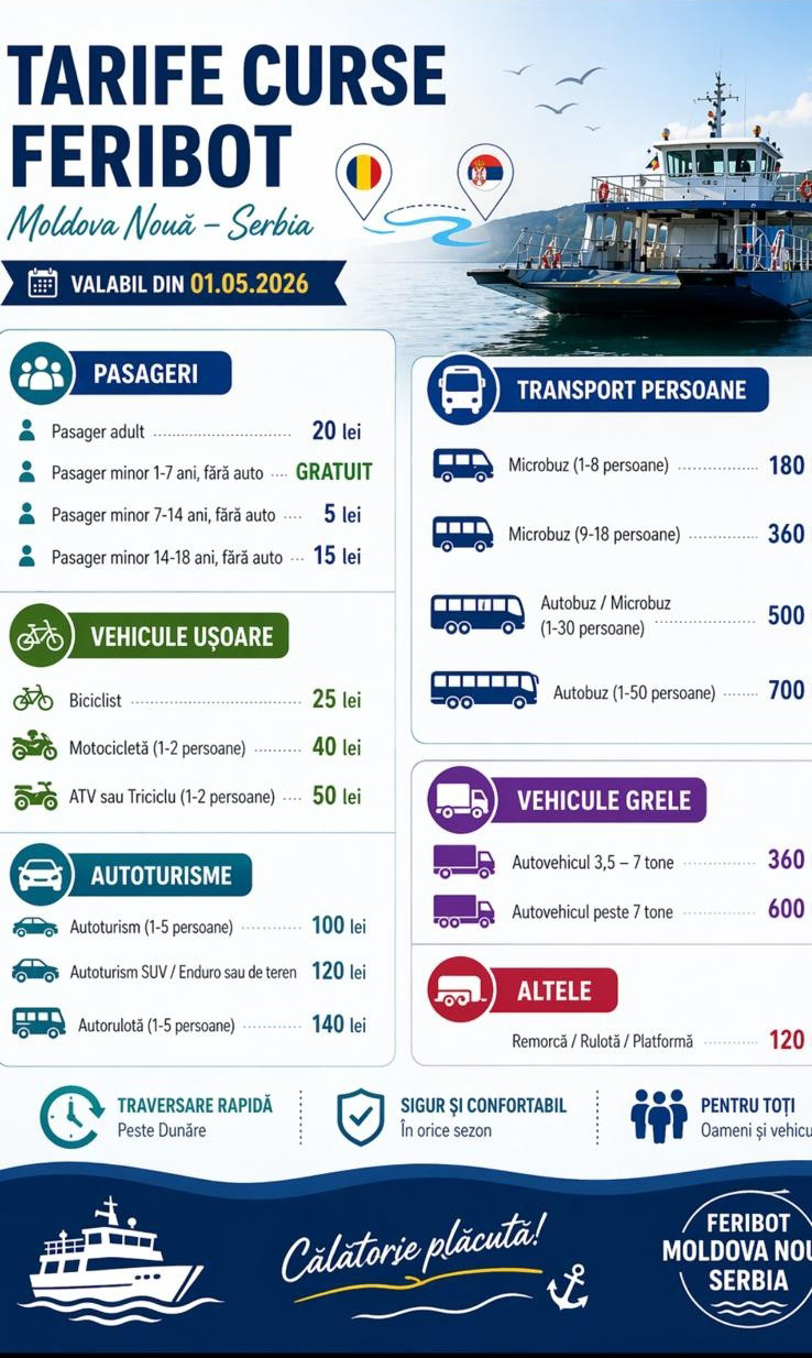 Primăria Moldova Nouă anunță oficial trecerea feribotului care leagă România de localitatea Usije (Serbia) la programul de vară, începând cu data de 1 mai, transformând traversarea fluviului în poarta principală către aventurile de weekend.
