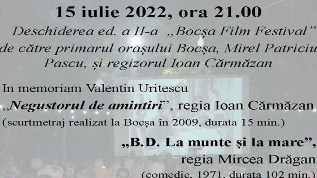 Cea de a doua ediție a festivalului de Film de la Bocșa își deschide de astăzi, de la ora 21, timp de 3 zile porțile, într-o locație cu un farmec aparte pentru bocșeni: Insula Paradis. La festivitatea de deschidere vor fi prezenți edilul orașului Mirel Patriciu Pascu și regizorul Ion Cărmăzan, originar din Bocșa.