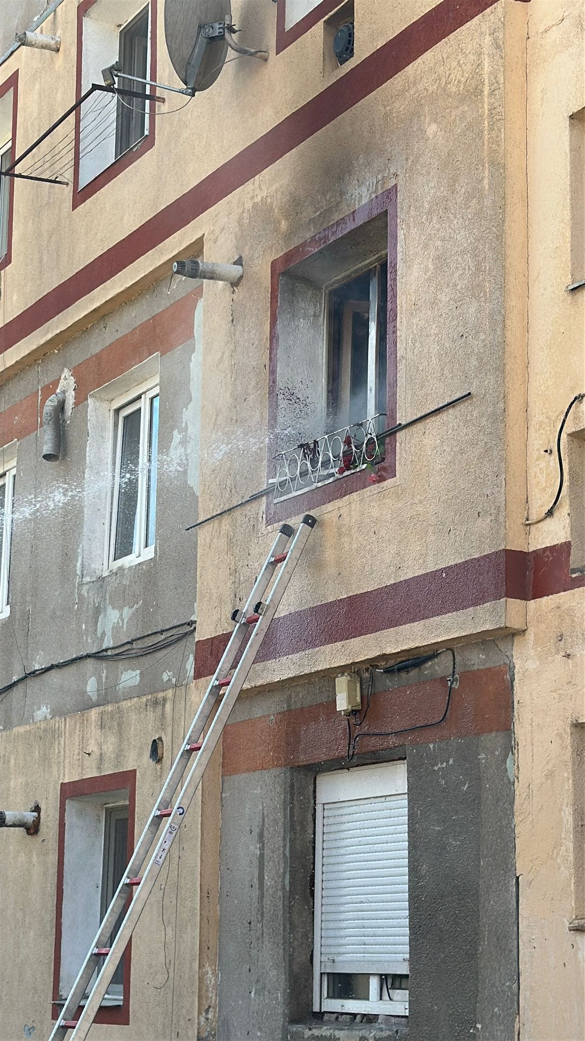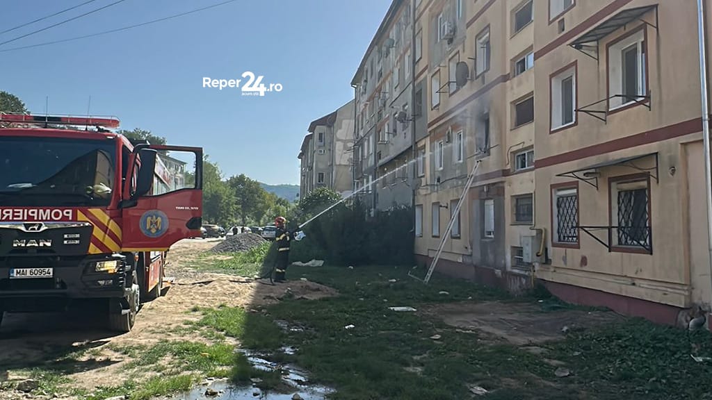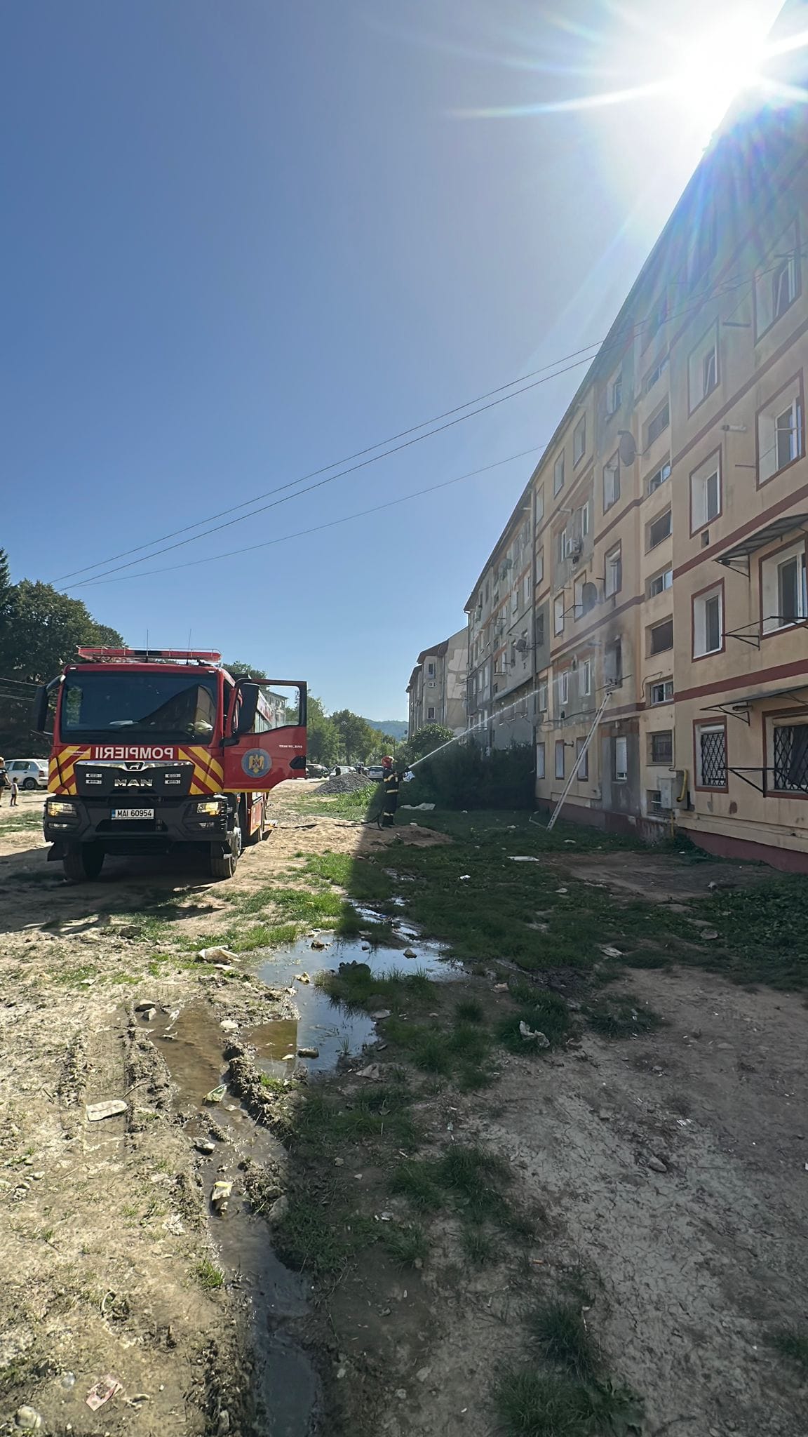 „Incendiul se manifestă cu flacără deschisă în interiorul unei camere, iar echipele de intervenție lucrează la stingerea acestuia.