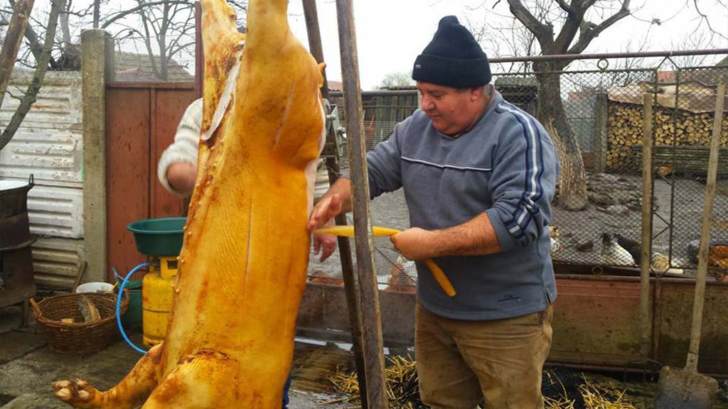 Bărbaţii sunt cei care se ocupă de sacrificarea animalului, iar tradiţia cere ca acela care taie porcul să fie un om curat, care înainte de sacrificiu trebuie să meargă la Biserică, să se spovedească, părintele iertându-i şi păcatul uciderii porcului. În unele regiuni chiar şi gospodăria este sfinţită înainte de sacrificare. Se spune că femeile nu au voie să participe la tăierea porcului nici măcar pentru a turna băutură în paharele bărbaţilor, deoarece, fiindu-le milă, animalul nu poate muri. Rolul femeilor începe în momentul în care carnea de porc ajunge pe masa din bucătărie, pentru a fi preparată.