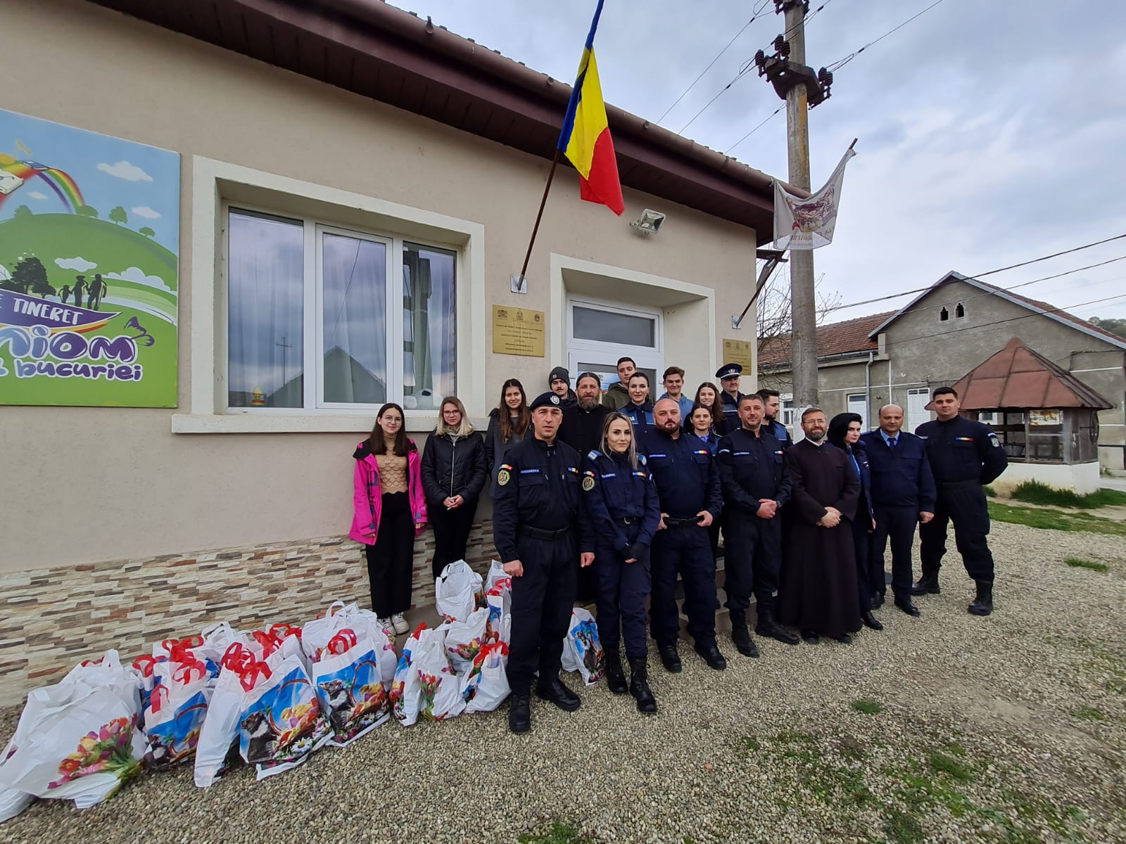 „În Săptămâna Mare și în pragul Sfintei Sărbători a Învierii Domnului, 30 de familii numeroase din cele două municipii din județ au primit pachete cu alimente și dulciuri, pregătite cu drag și împărțite de către voluntarii de la ATOR- Banatul de Munte și Centrul de Tineret Moniom, cu sprijinul nostru, al polițiștilor, și al colegilor jandarmi.
