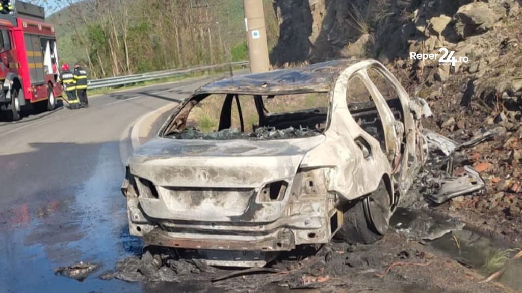 O mașină s-a făcut scrum în această dimineață pe DN 57, în județul Caraș-Severin. Pentru stingerea flăcărilor au intervenit pompierii din cadrul Secției Moldova Nouă, cu o autospecială de stingere cu apă și spumă și o ambulanță SMURD.