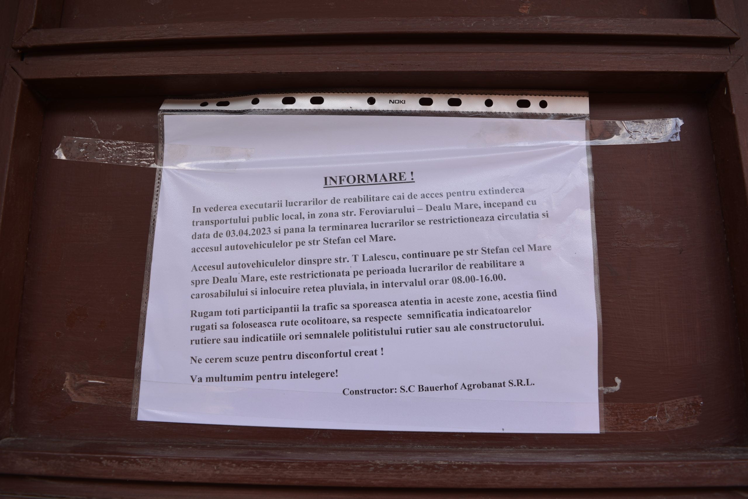 „Accesul autovehiculelor dinspre strada Traian Lalescu, continuare pe strada Ștefan cel Mare spre Dealu Mare, este restricționat, în intervalul orar 08:00 -16:00, pe perioada lucrărilor de reabilitare a carosabilului și înlocuire a rețelei pluviale.