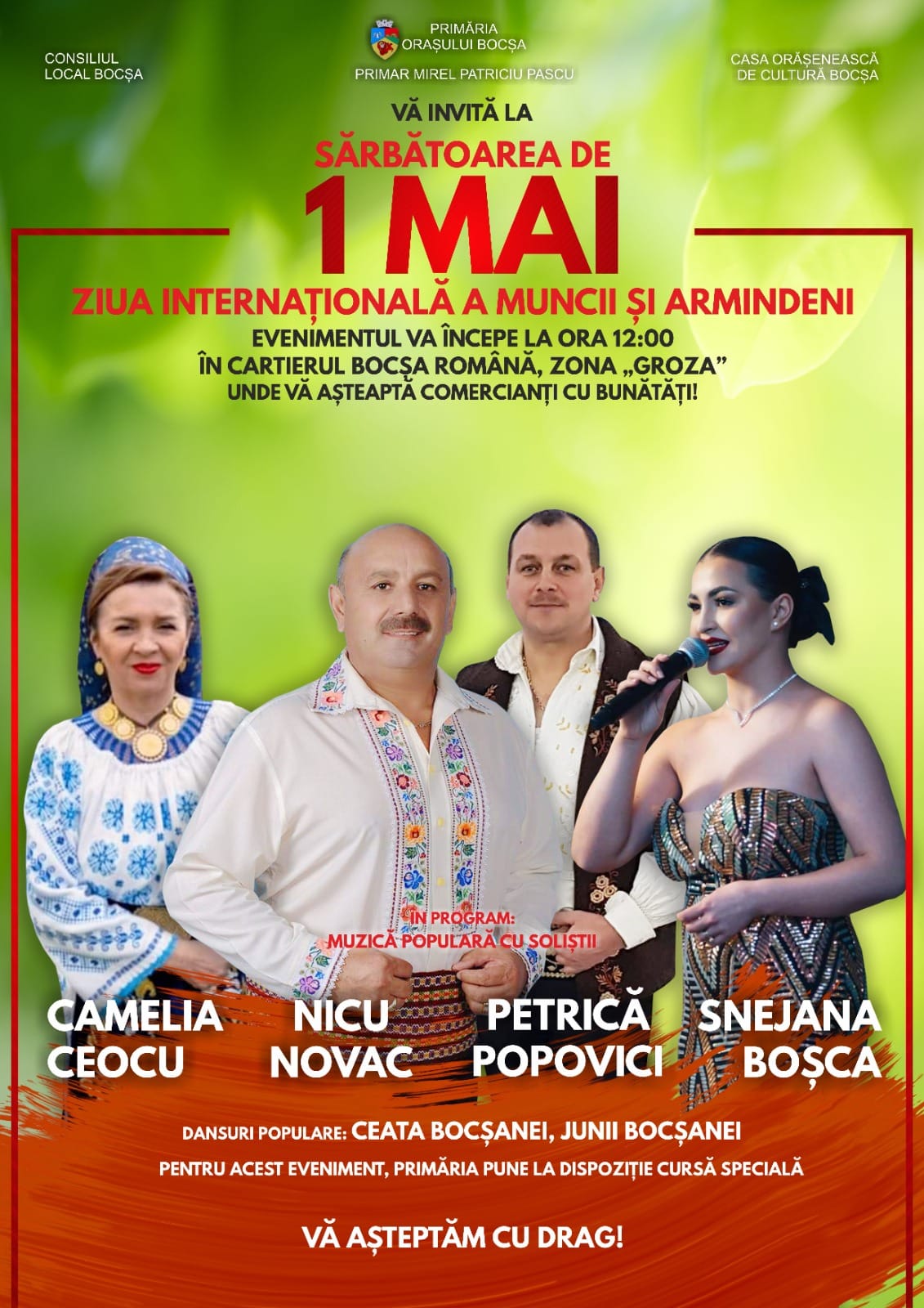 Spectacolul folcloric va fi susținut de soliștii vocali Nicu Novac, Camelia Ceocu, Petrică Popovici și Snejana Boșca și de dansatorii de la Ceata Bocșanei și Junii Bocșanei pregătiți sub bagheta coregrafilor prof. Octavian Peptenar și Ilia Ciurcia, iar intrarea la eveniment este liberă.