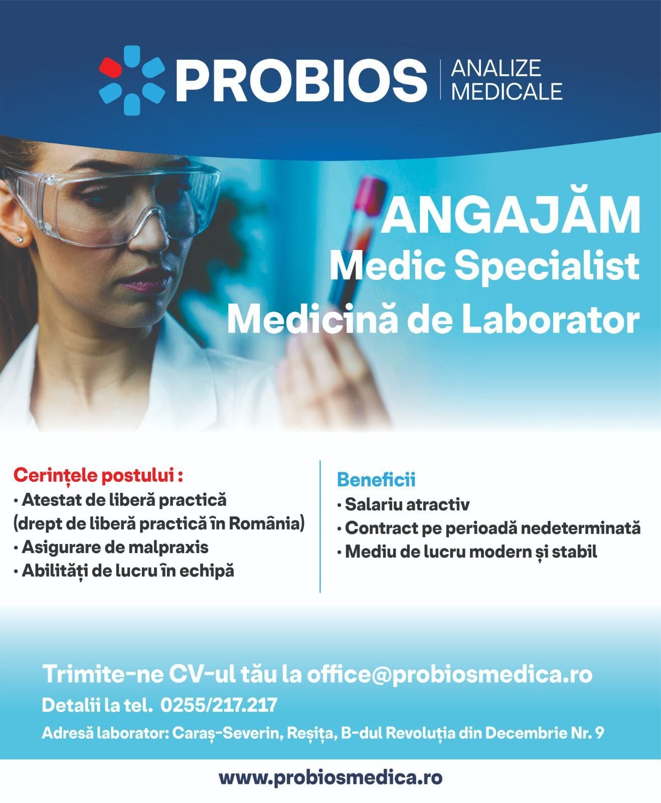 PROBIOS MEDICA, cea mai longevivă clinică de analize medicale din Reșița (cu o tradiție de peste 20 de ani), își extinde echipa!
