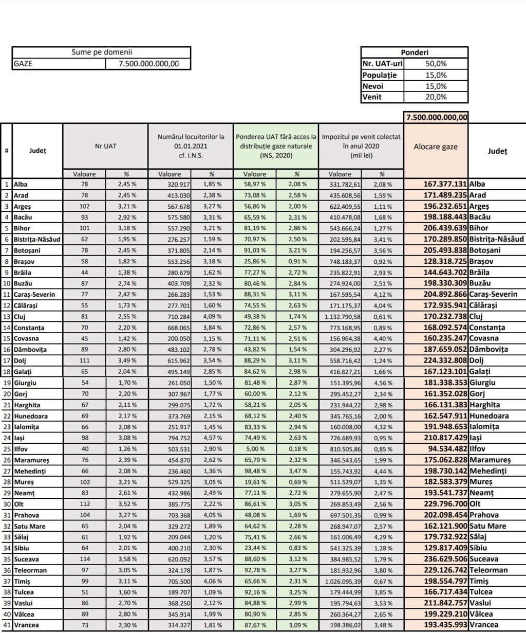 Criteriile de selectare care au fost luate în considerare la alocarea sumelor au fost numărul de unități administrativ-teritoriale dintr-un județ, numărul de locuitori, ponderea localităților (UAT) unde gospodăriile nu sunt racordate la rețeaua de distribuție a gazelor naturale și impozitul pe venit colectat – a spus ministrul, subliniind că, la alocarea fondurilor disponibile au contat doar aceste date statistice.