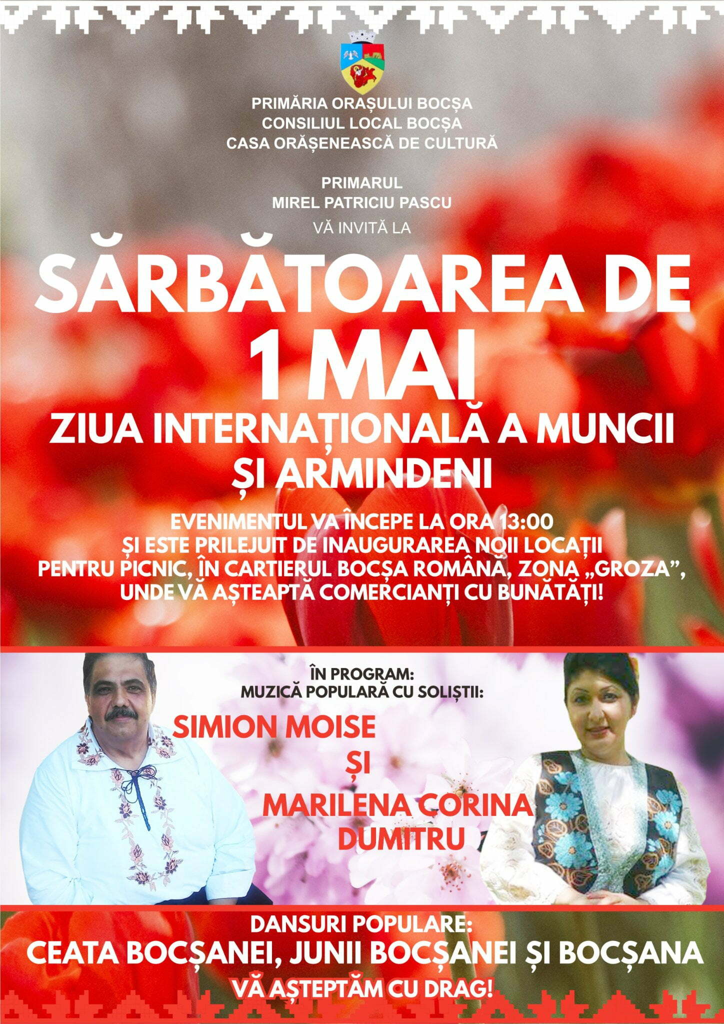 Primăria orașului Bocșa a pregătit o surpriză locuitorilor orașului cu prilejul Zilei Internaționale a Muncii, 1 mai și a sărbătorii de Armindeni. Astfel, Primăria orașului, Consiliul Local, Casa orășenească de Cultură și edilul Mirel Patriciu Pascu vor organiza o petrecere câmpenească cu muzică, voie bună și tradiționalii mici, în prima zi a lunii mai.