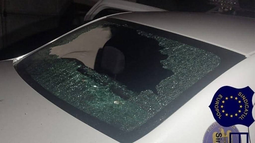 La fața locului, polițiștii au fost întâmpinați cu violență: mai mulți indivizi aflați într-un apartament de la etajul doi al unui bloc au început să arunce cu sticle și obiecte contondente asupra echipajului. În urma atacului, unul dintre polițiști a fost rănit în zona capului, iar luneta autospecialei de poliție a fost spartă.