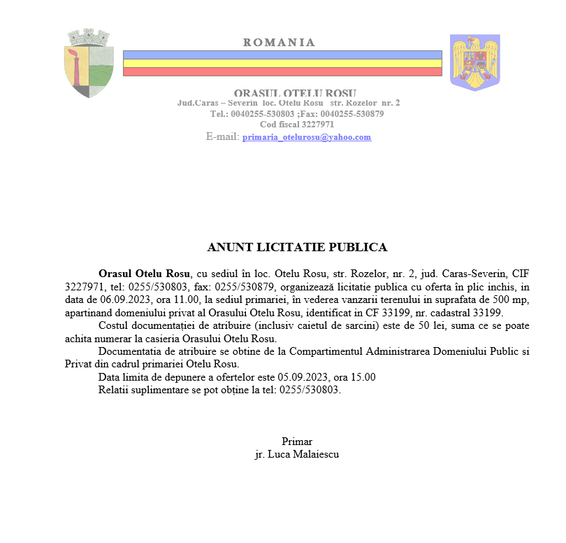 Anunțuri Primăria Oțelu Roșu – Anunț Licitație Publică 2 10 august 2023 Acțiune FacebookWhatsAppEmailImprimare Acțiune FacebookWhatsAppEmailImprimare Articolul precedentPrimăria Oțelu Roșu – Anunț Licitație Publică 1Articolul următorPrimăria Oțelu Roșu – Anunț Licitație Publică 3 Știrile zilei APIA avertizează: Campanie de SMS-uri false care vizează beneficiarii plăților! 19 aprilie 2026 Investiție majoră la Oravița: Spitalul Orășenesc a fost dotat cu un tomograf de ultimă generație 19 aprilie 2026 Moldova Nouă reciclează. Scapă de electrocasnicele vechi și poți câștiga un premiu 19 aprilie 2026