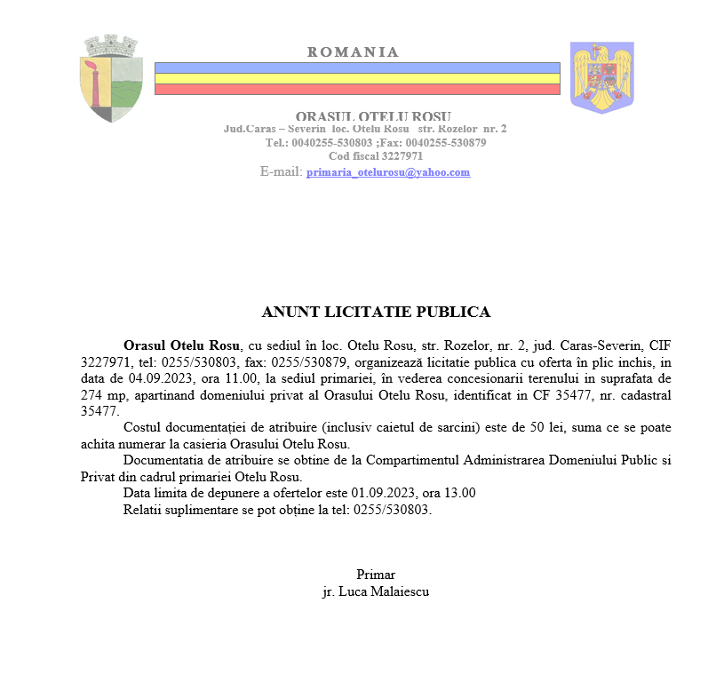 Anunțuri Primăria Oțelu Roșu – Anunț Licitație Publică 3 10 august 2023 Acțiune FacebookWhatsAppEmailImprimare Acțiune FacebookWhatsAppEmailImprimare Articolul precedentPrimăria Oțelu Roșu – Anunț Licitație Publică 2Articolul următorLiberalii, ajunși la mâna PMP-ului, dispuși să renunțe la un post de vicepreședinte în Consiliul Județean Caraș-Severin! Știrile zilei APIA avertizează: Campanie de SMS-uri false care vizează beneficiarii plăților! 19 aprilie 2026 Investiție majoră la Oravița: Spitalul Orășenesc a fost dotat cu un tomograf de ultimă generație 19 aprilie 2026 Moldova Nouă reciclează. Scapă de electrocasnicele vechi și poți câștiga un premiu 19 aprilie 2026