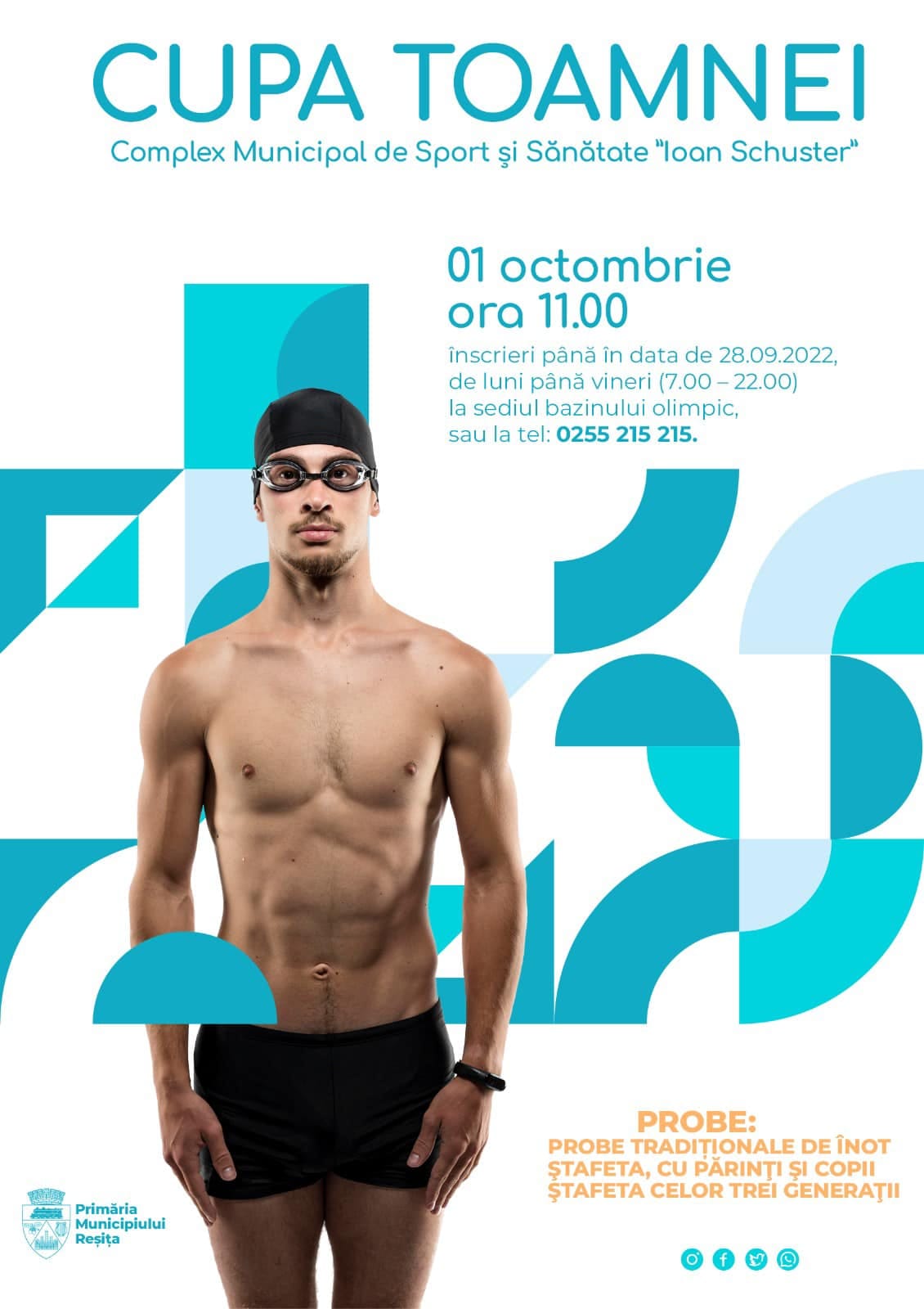 „Cupa Toamnei” va avea loc sâmbătă, 1 octombrie, începând cu ora 11:00, la Complexul Municipal de Sport și Sănătate „Ioan Schuster”. Pe lângă probele tradiţionale de înot, în cadrul competiției vor fi organizate și probe de echipe dedicate familiilor – ştafeta cu părinţi şi copii, respectiv ştafeta celor trei generaţii, incluzând părinţii, copii şi bunici.