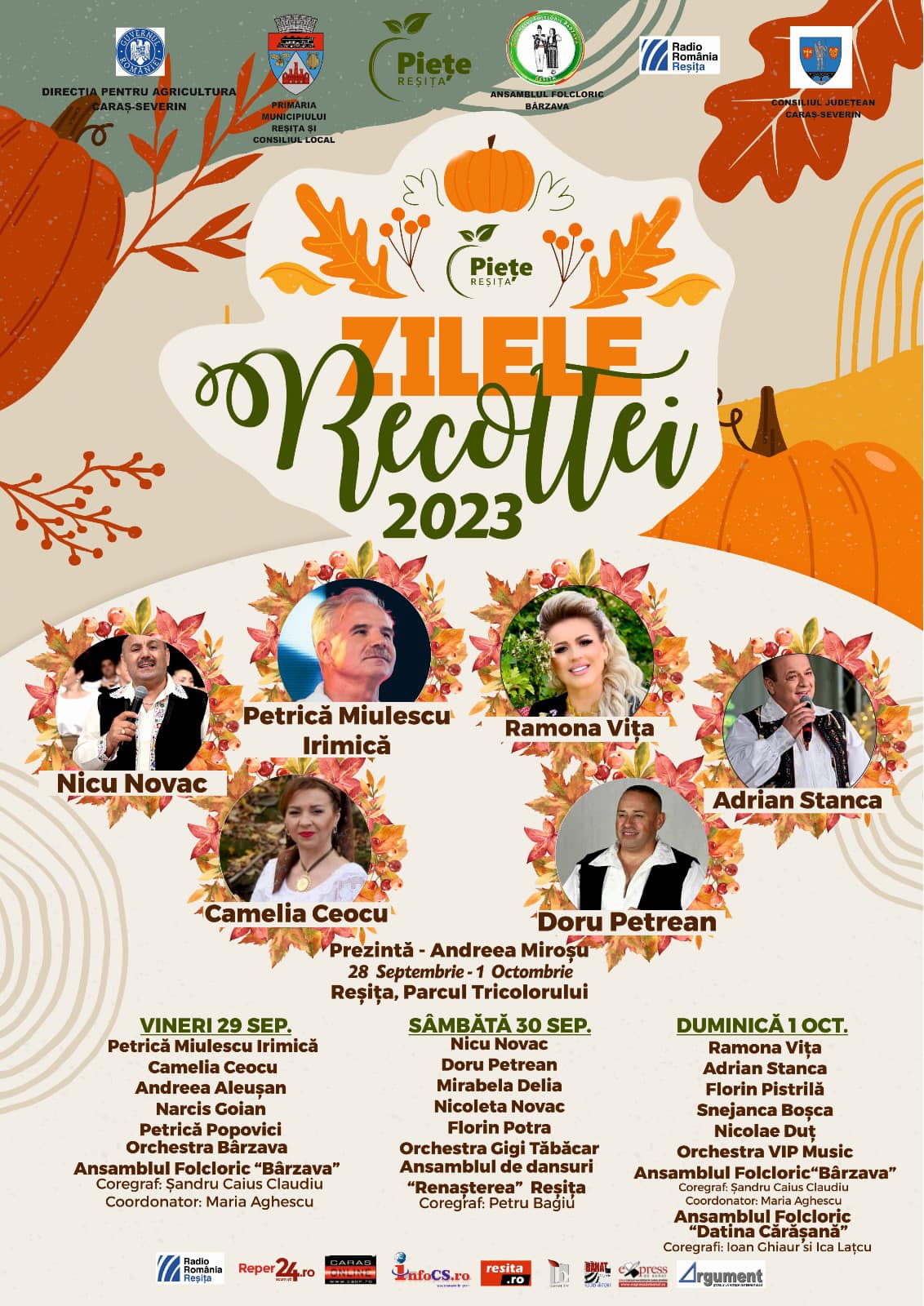 - Vineri, 29 septembrie: Patrică Miulescu Irimică, Camelia Ceocu, Andreea Aleușan, Narcis Goian, Petrică Popovici, Orchestra Bârzava