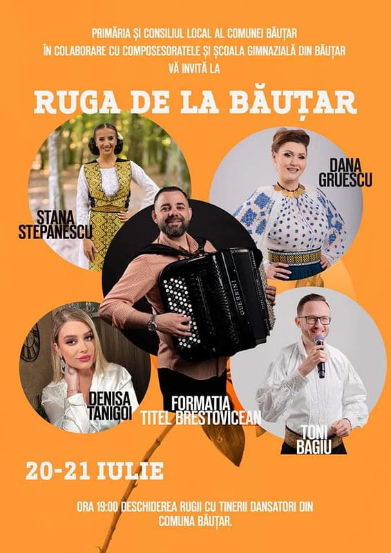 Ruga va fi deschisă de tinerii dansatori din comună începând cu orele 19:00. Atmosfera va fi întreținută de soliștii de muzică populară Stana Stepanescu, Dana Gruescu, Denisa Tanigoi, Toni Bagiu și Formația Titel Brestovicean.