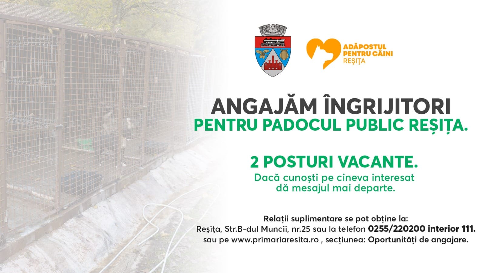 „Dacă iubești animalele și îți dorești să contribui la îngrijirea lor zilnică, te așteptăm la interviu. Detalii despre condițiile de angajare și documentele necesare găsești în linkul de mai jos: https://www.primariaresita.ro/…/concursuri-00021ed2… , se arată în anunțul Primăriei Municipiului Reșița.