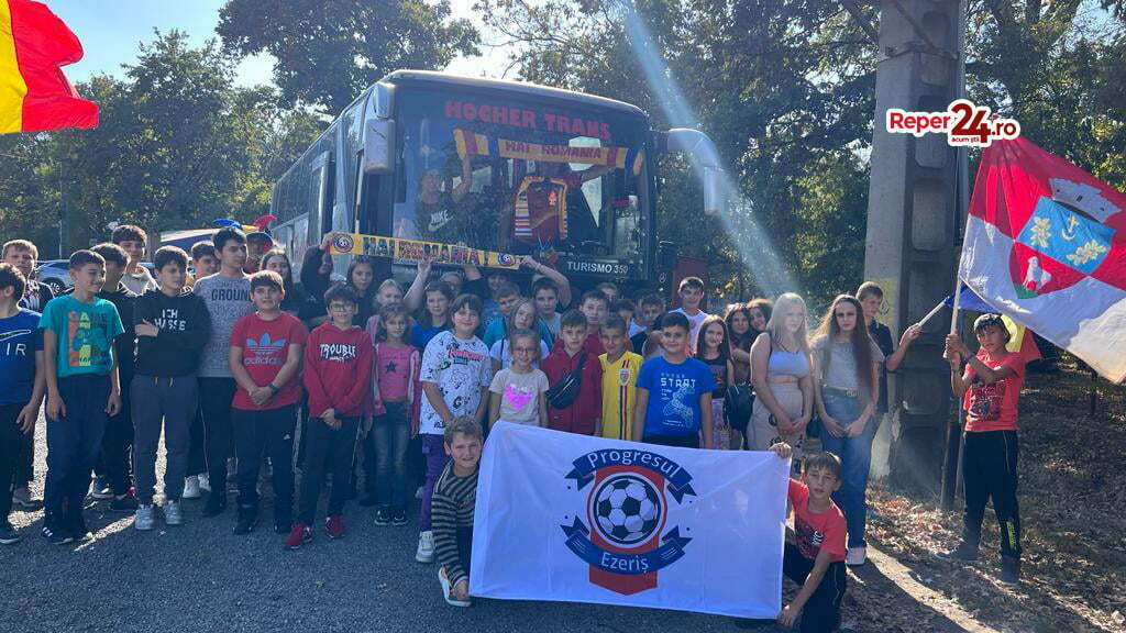 Una din imaginile zilei a fost surprinsă cu copiii de la școlile din Fârliug și Ezeriș ( Școală gimnazială Farliug- Scoala gimnazială Aurel Peia Ezeriș), pregătiți de îmbarcare în drumul spre capitala București, pentru a fi alaturi de selecționata României în meciul de astăzi.
