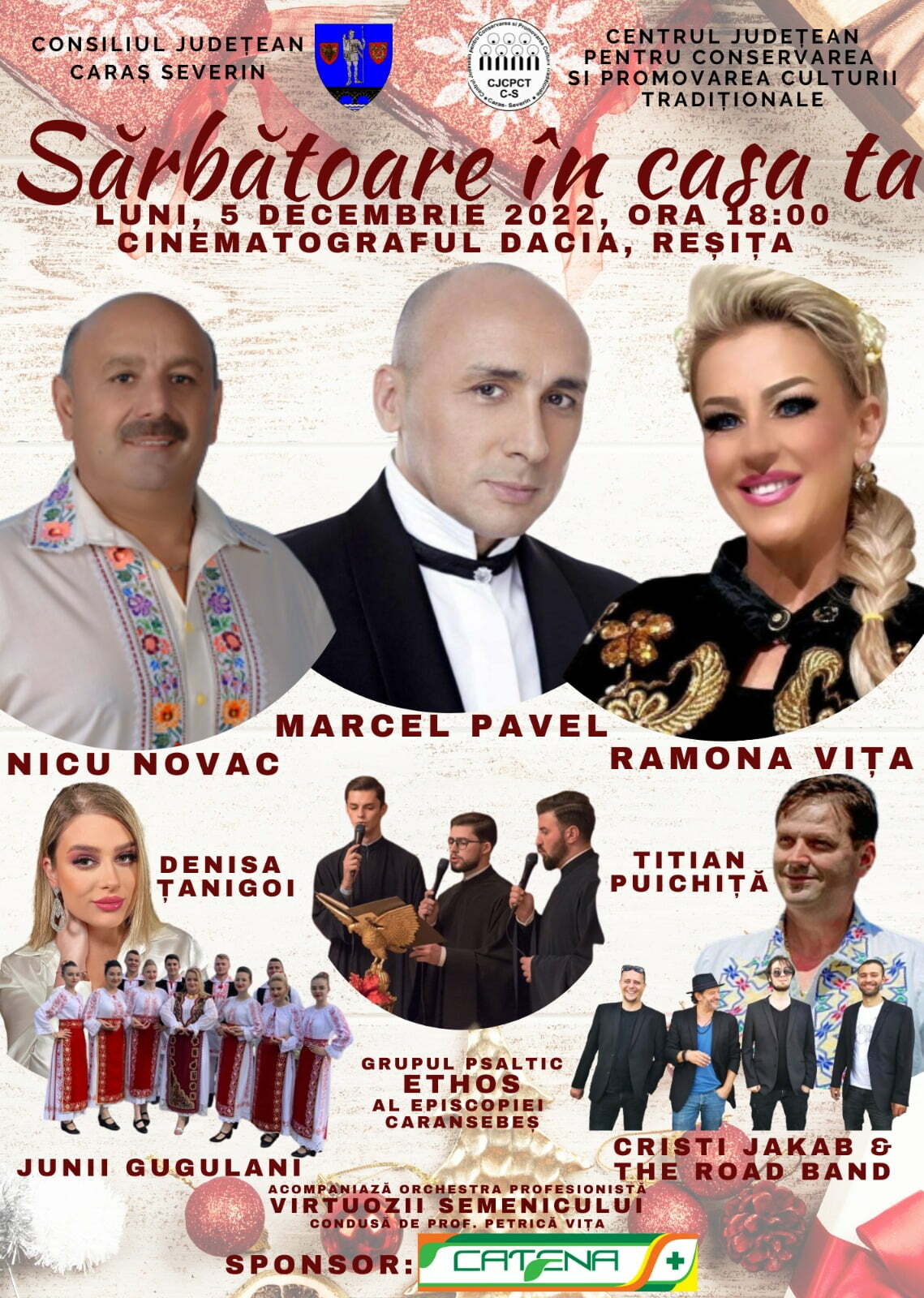 În seara de 5 decembrie, de la ora 18:00, la sala cinematografului Dacia din municipiul Reșița va avea loc un spectacol organizat de Consiliul Județean Caraș-Severin, prin Centrul Județean pentru Conservarea și Promovarea Culturii Tradiționale Caraș-Severin în care muzica ușoară, folclorul bănățean și colindele specifice acestei perioade a anului vor fi liantul balsam pentru sufletele celor ce se lasă alintați de cântecul românesc.