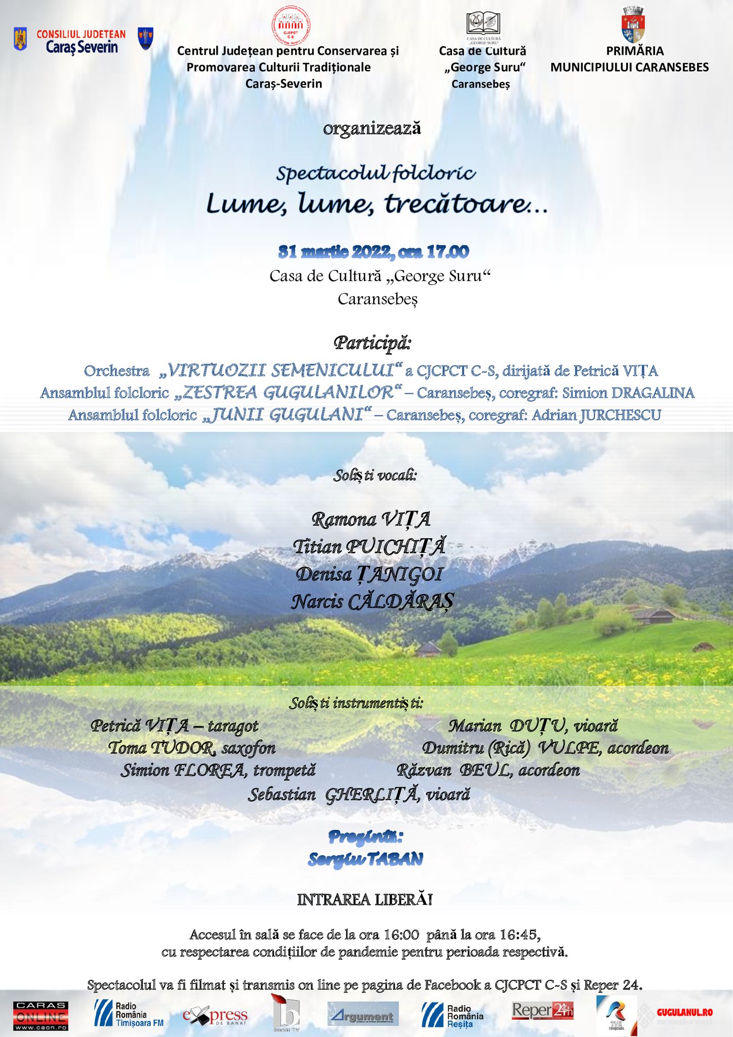 Consiliul Județean Caraș-Severin, Centrul Județean pentru Conservarea și Promovarea Culturii Tradiționale Caraș-Severin, Casa de Cultură „George Suru“ Caransebeș și Primăria Caransebeș organizează în data de 31 martie 2022, ora 17:00 spectacolul folcloric „Lume, lume, trecătoare“.