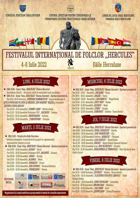 Consiliul Judeţean Caraş-Severin, Centrul Judeţean pentru Conservarea şi Promovarea Culturii Tradiţionale Caraş-Severin, Primăria și Consiliul Local Băile Herculane organizează în perioada 4-8 iulie 2022, Festivalul Internaţional de Folclor „Hercules“, ediţia cu numărul 52, în fapt cea mai longevivă manifestare folclorică din sfera Banatului de Munte.