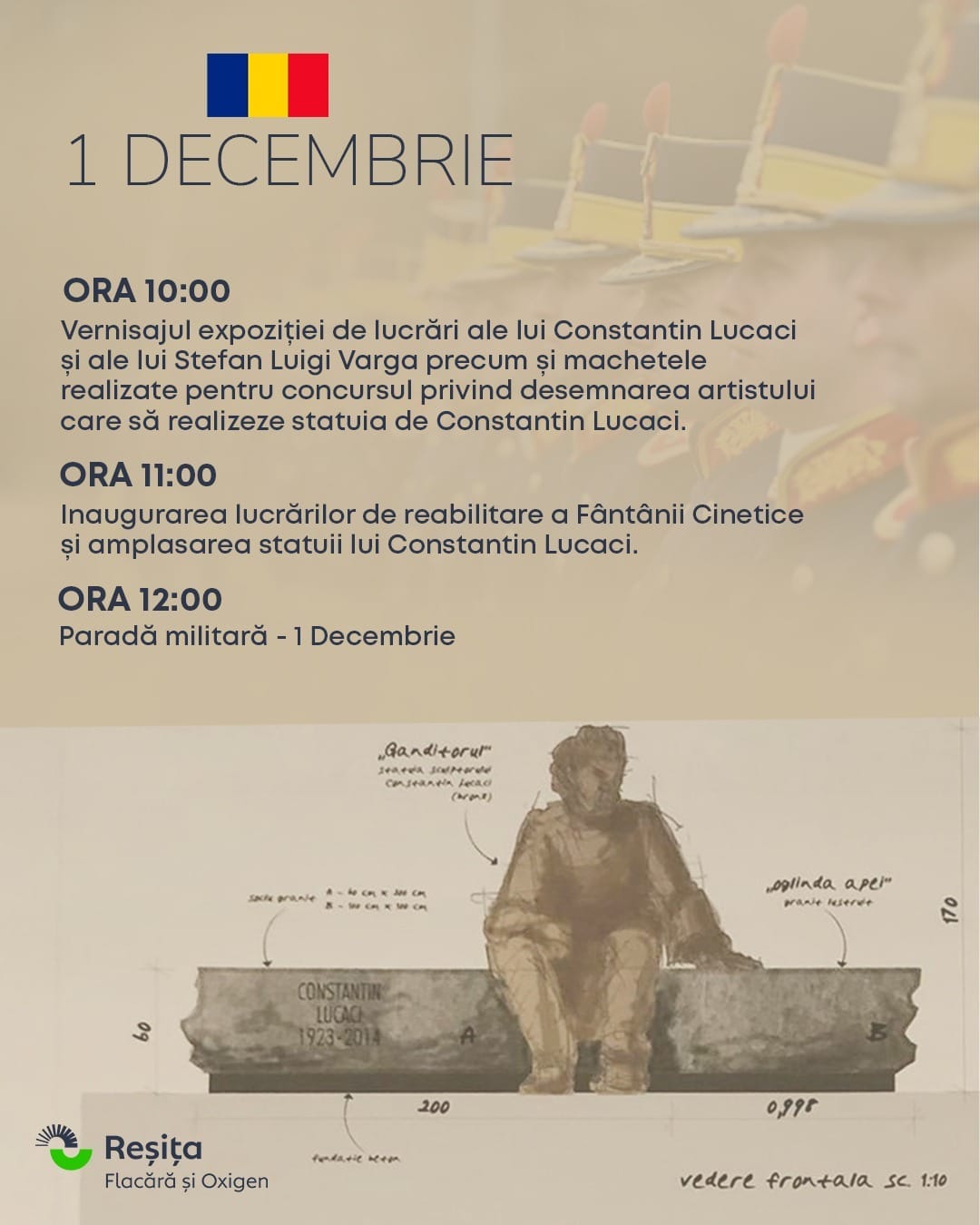Anterior, la ora 10:00, este programat vernisajul unei expoziții cu lucrări semnate Constantin Lucaci și Stefan Luigi Varga. Vor fi expuse și „machetele realizate pentru concursul privind desemnarea artistului care să realizeze statuia lui Constantin Lucaci, sculptorul care a creat fântâna cinetică, unul dintre simbolurile Reșiței”, anunță reprezentanții Primăriei Reșița.