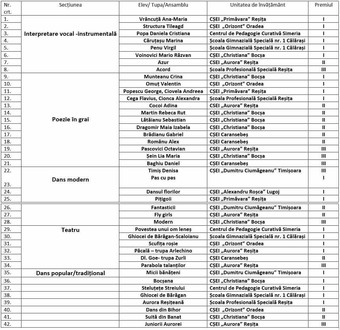 Premii SPECIALE ale juriului: Căruțașu Marina – Școala Gimnazială Specială nr. 1 Călărași, Trupa Ghiocei de Bărăgan – Școala Gimnazială Specială nr. 1 Călărași și Trupa Tic -Tac – CȘEI „Aurora” Reșița.