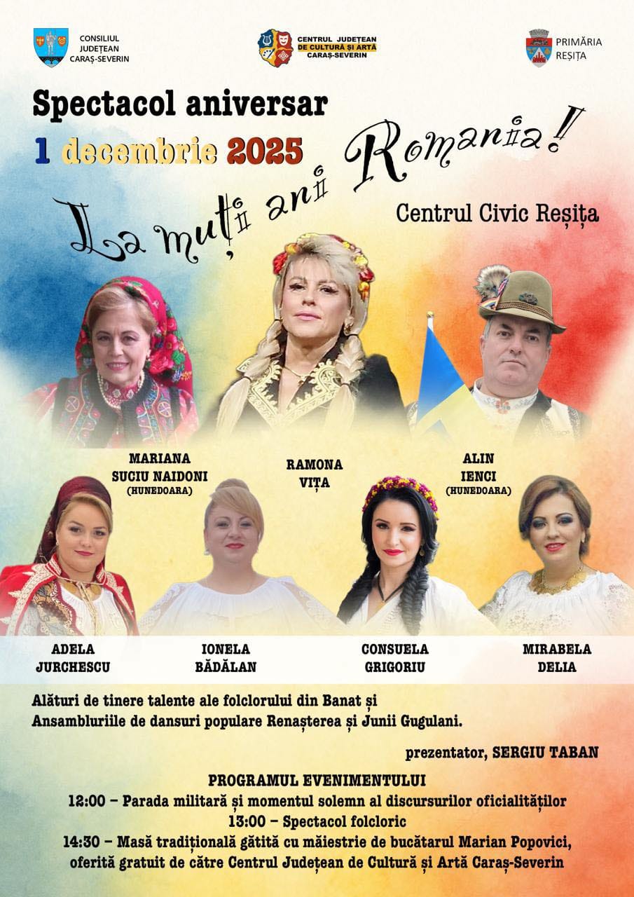 Ziua Națională a României va fi marcată la Reșița cu o paradă militară și un spectacol folcloric. Nu vor lipsi nici bucatele tradiționale, pregătite și anul acesta de bucătarul Marian Popovici și oferite de Centrul Județean de Cultură și Artă Caraș-Severin. Manifestările dedicate zilei de 1 Decembrie se vor desfășura în centrul civic al municipiului, cu începere de la ora 12:00.